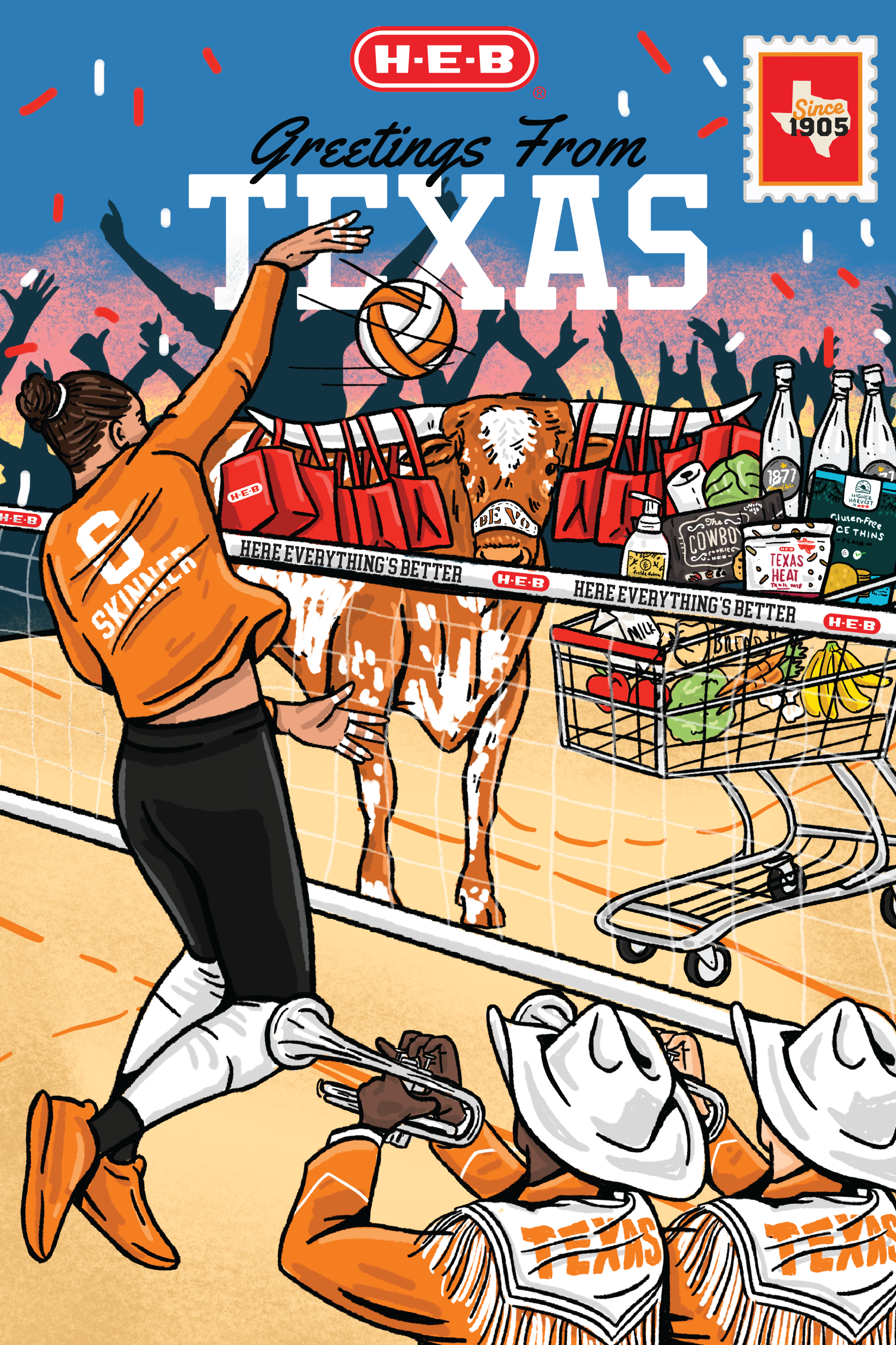 Postcard Illustration for HEB & The University of Texas, surrounding their partnership as well as NIL Sponsorship with athlete Madisen Skinner. Creative Direction by Owen Lindsey, in collaboration with Rally Dept.